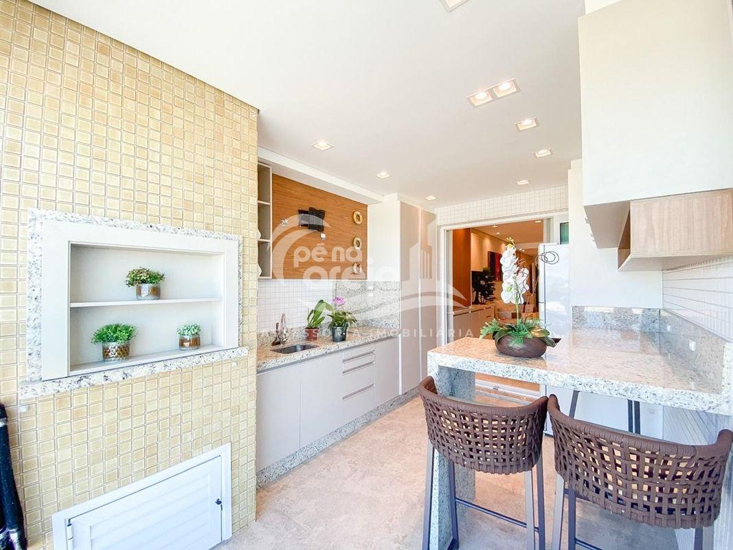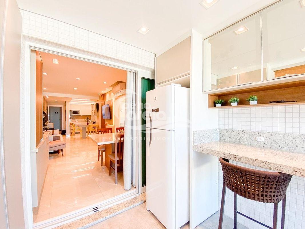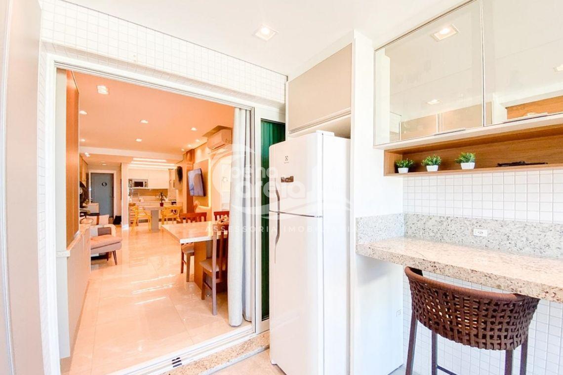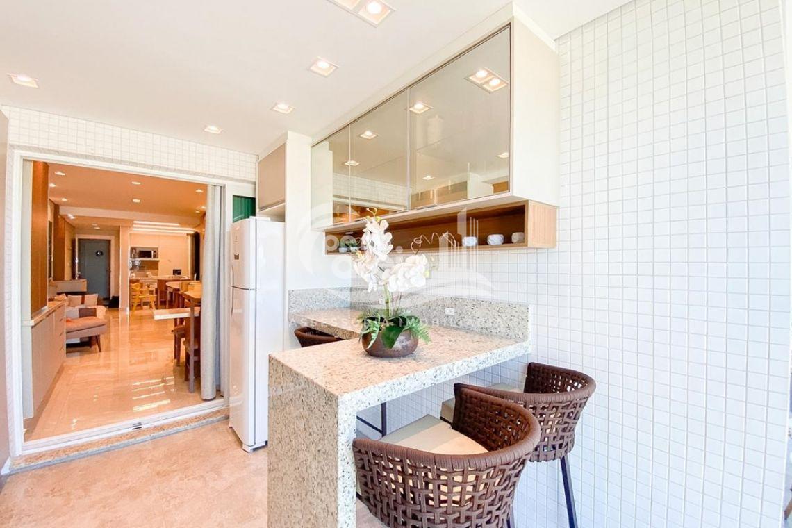 ✅ Sacada integrada a sala e a cozinha com o piso nivelado, churrasqueira à carvão, fechamento de vidro reiki e vista deslumbrante para o mar