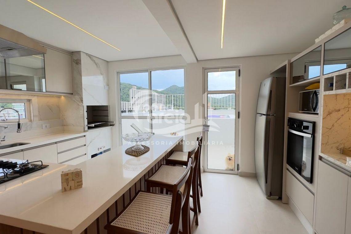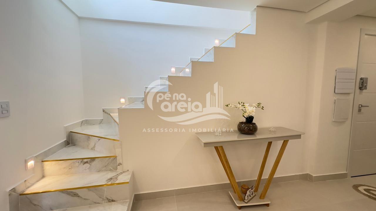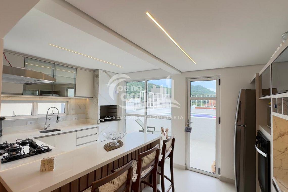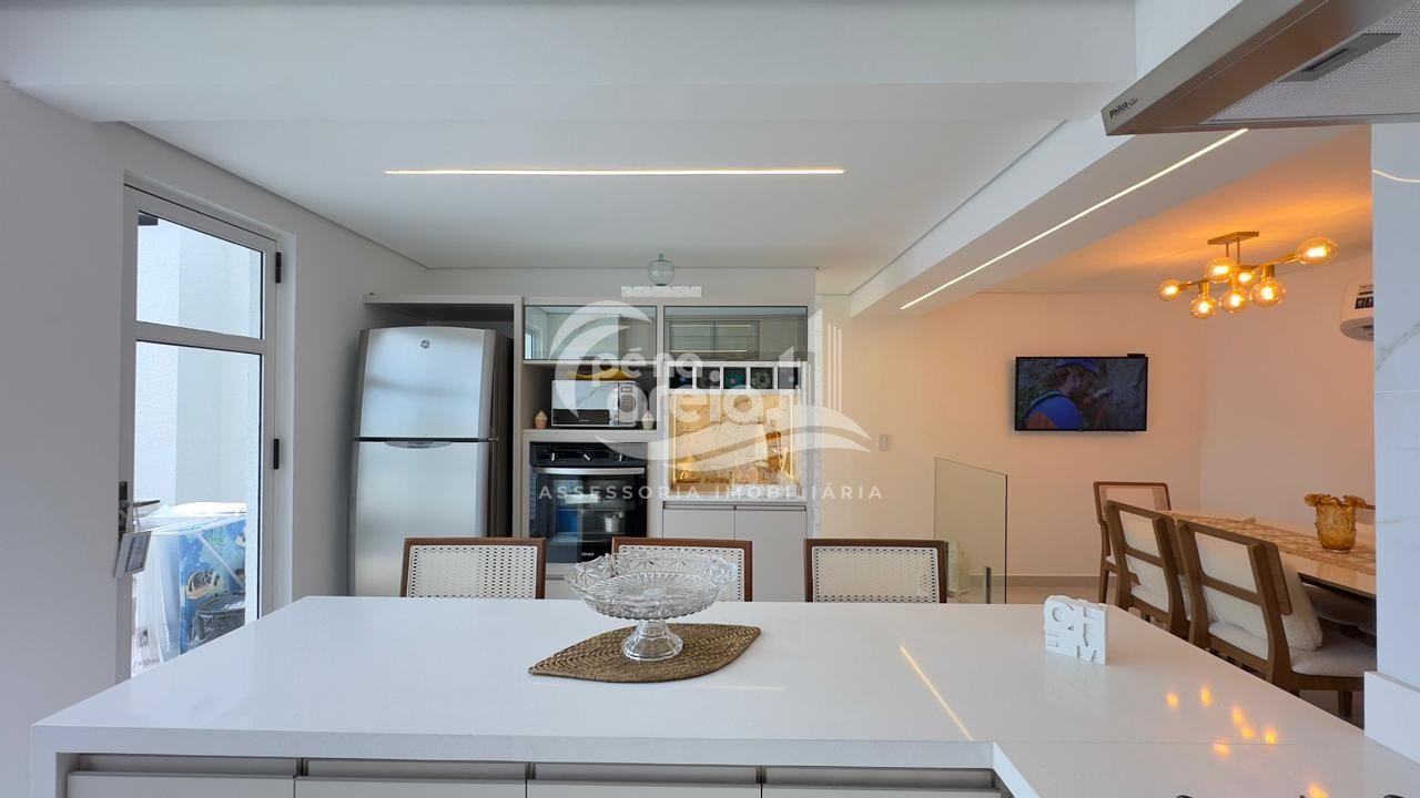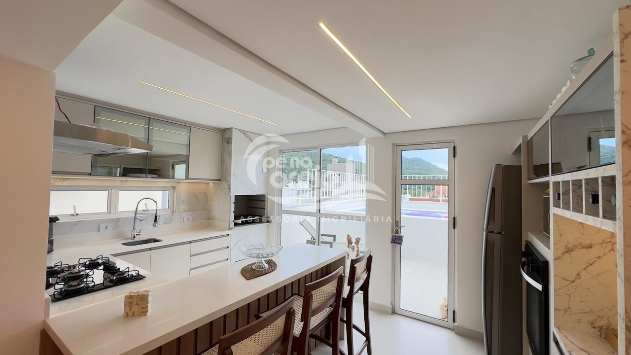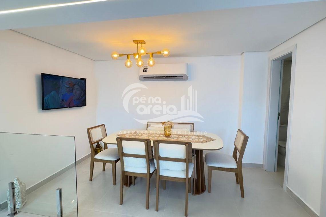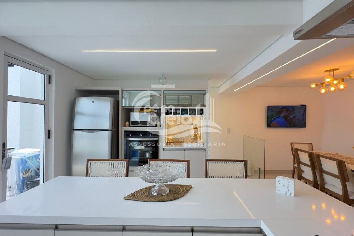 São 135 m² privativos, totalmente climatizada, finamente reformada e decorada. Possui ampla sala de estar com rebaixamento em gesso, 3 dormitórios (1 suíte) e banheiro social. No pavimento superior, sala de jantar integrada à cozinha sob medida, churrasqueira a carvão, lavabo e um incrível terraço com piscina exclusiva, ducha e vista para o mar e para a serra.