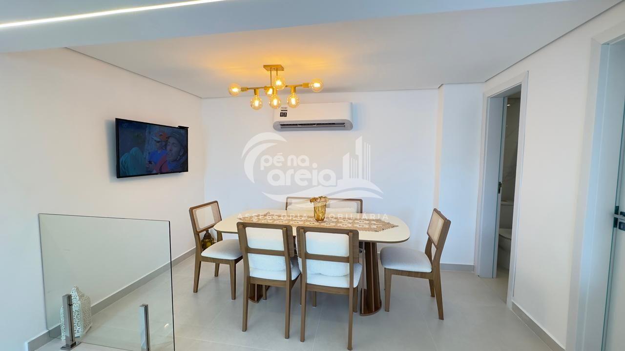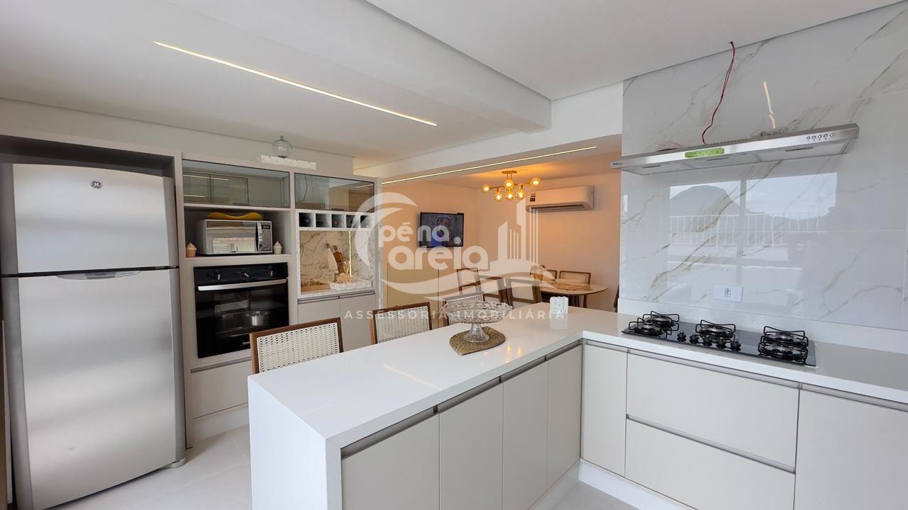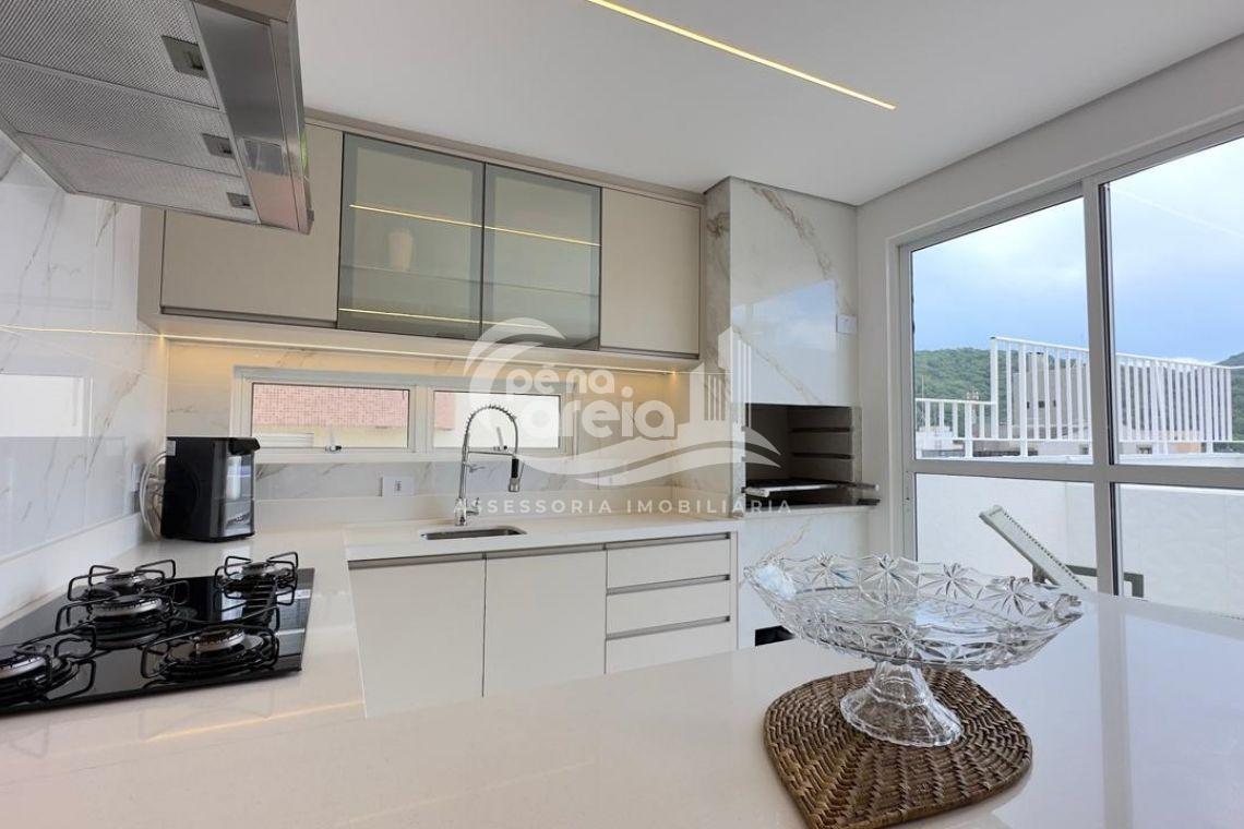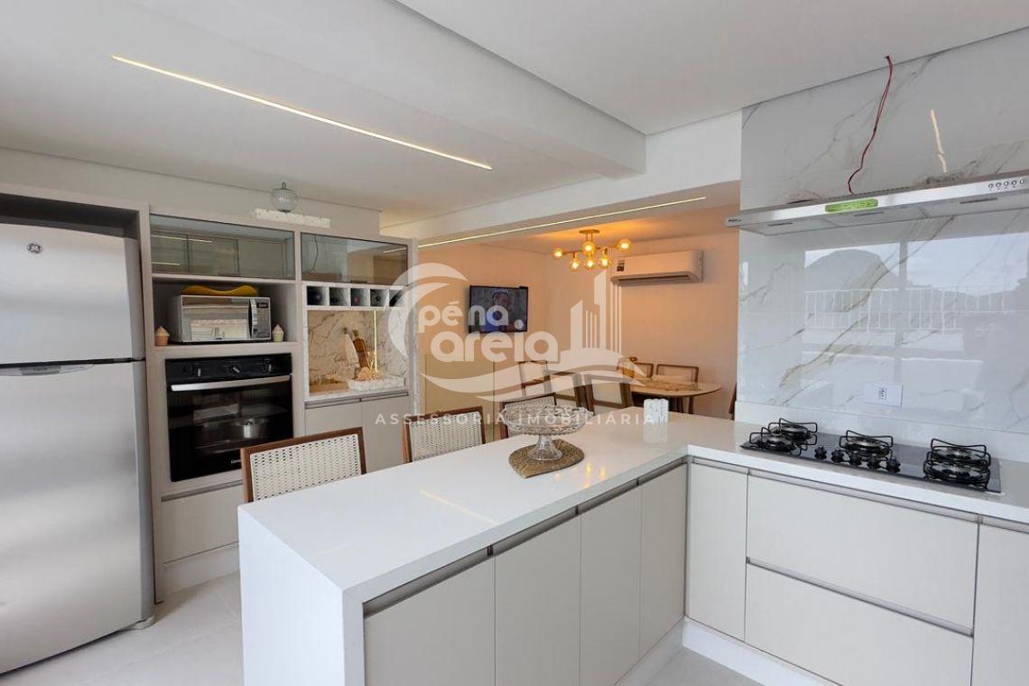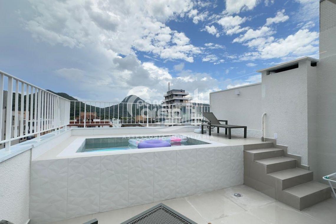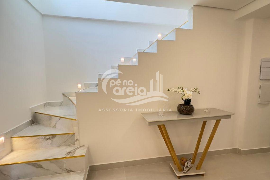 São 135 m² privativos, totalmente climatizada, finamente reformada e decorada. Possui ampla sala de estar com rebaixamento em gesso, 3 dormitórios (1 suíte) e banheiro social. No pavimento superior, sala de jantar integrada à cozinha sob medida, churrasqueira a carvão, lavabo e um incrível terraço com piscina exclusiva, ducha e vista para o mar e para a serra.