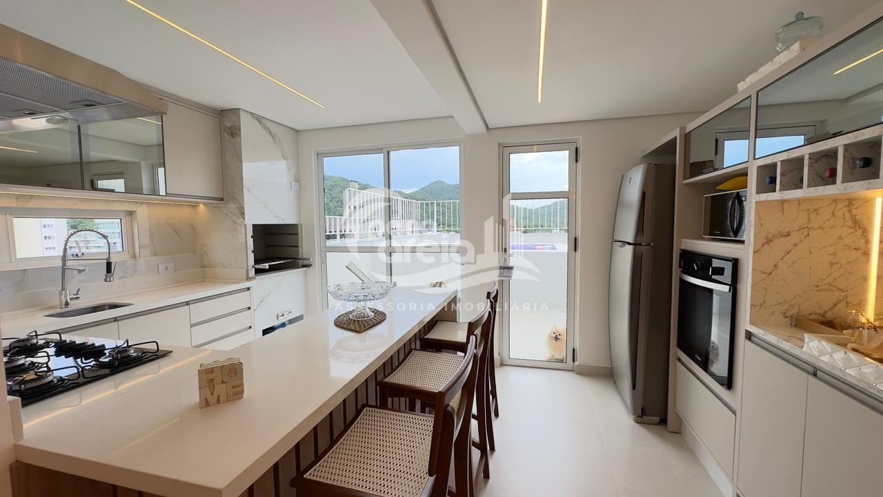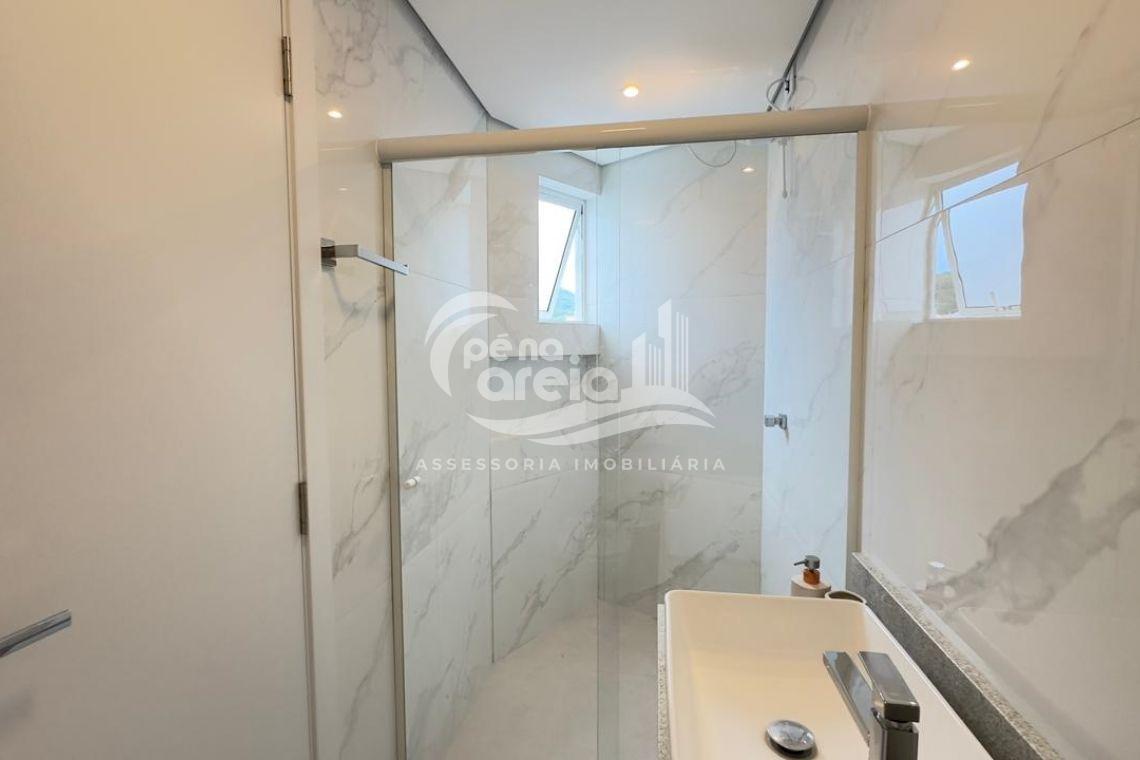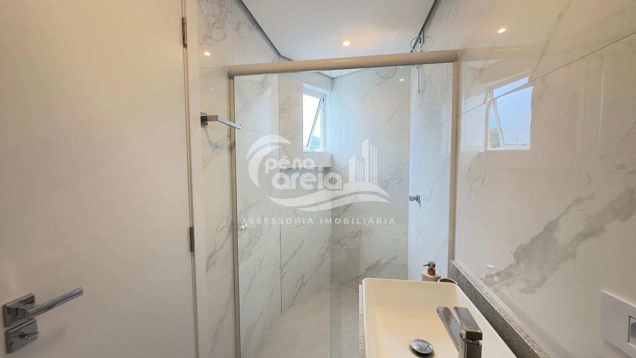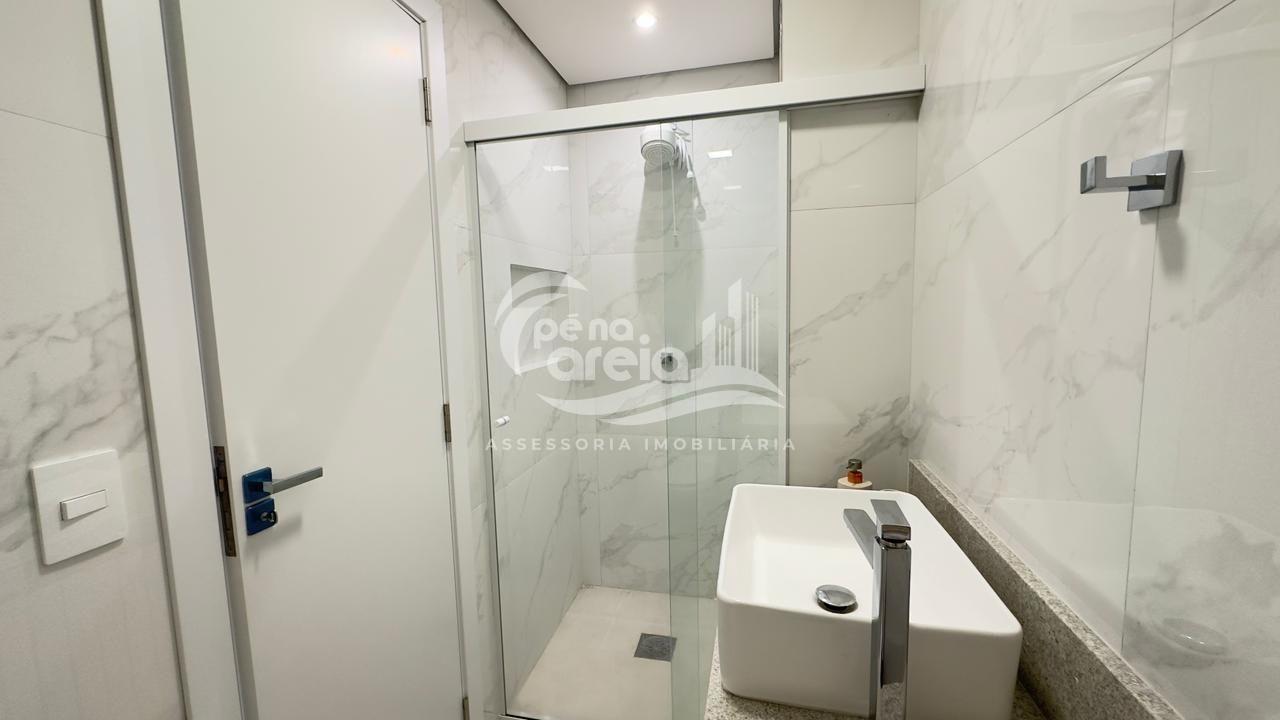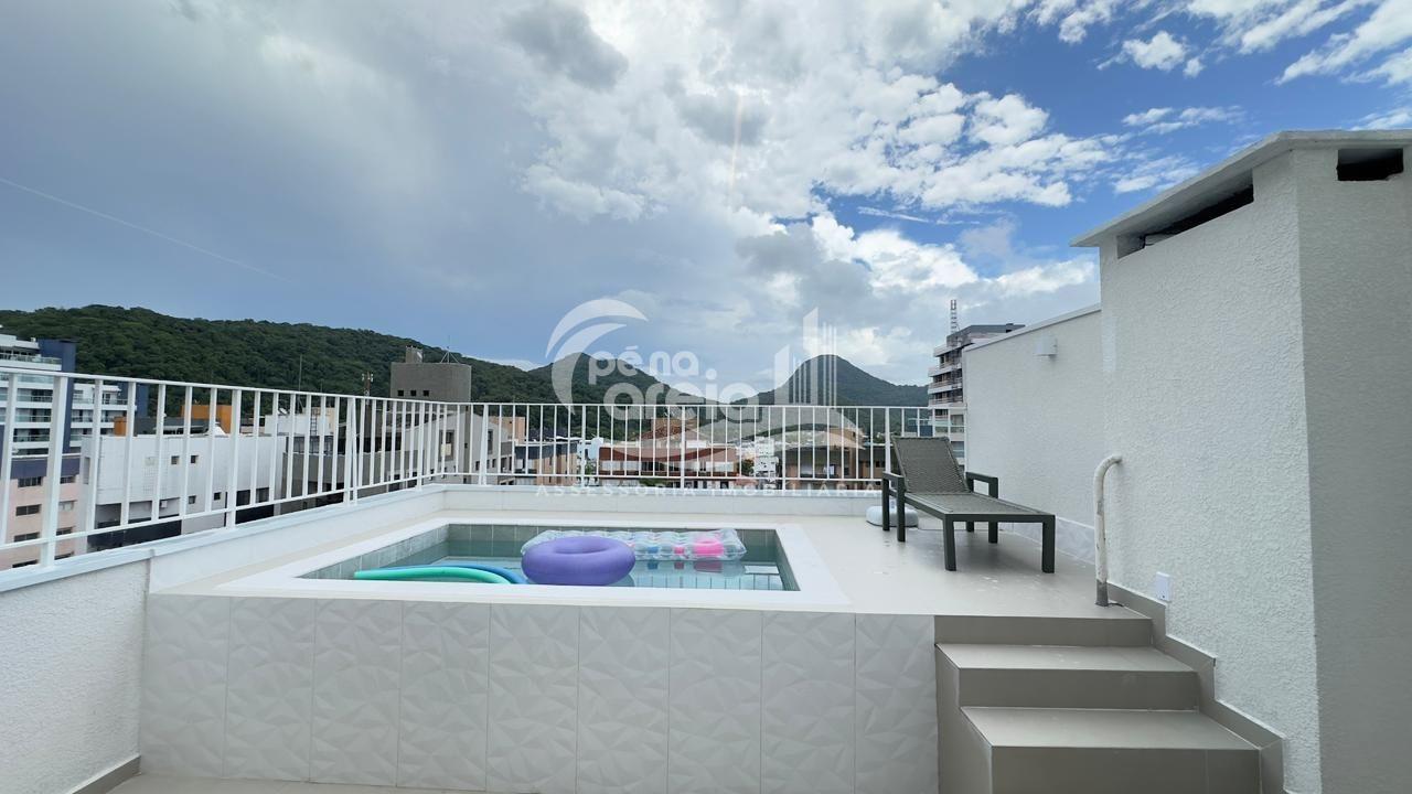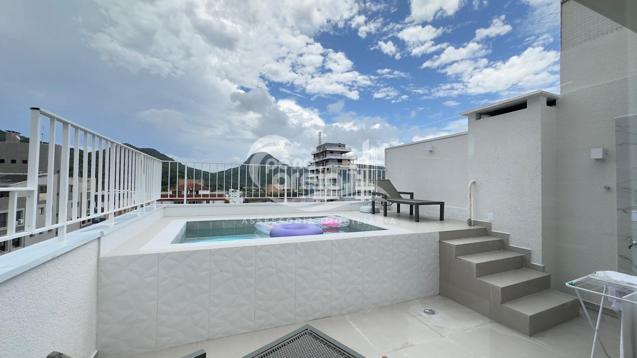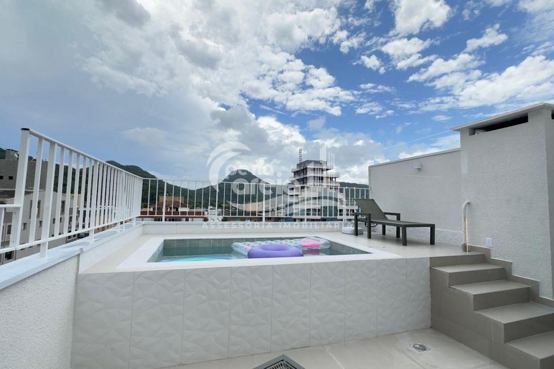 São 135 m² privativos, totalmente climatizada, finamente reformada e decorada. Possui ampla sala de estar com rebaixamento em gesso, 3 dormitórios (1 suíte) e banheiro social. No pavimento superior, sala de jantar integrada à cozinha sob medida, churrasqueira a carvão, lavabo e um incrível terraço com piscina exclusiva, ducha e vista para o mar e para a serra.