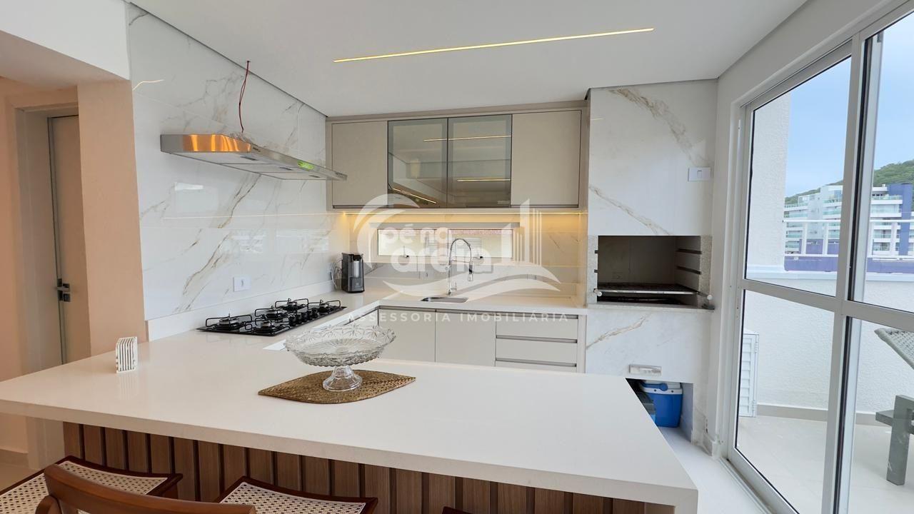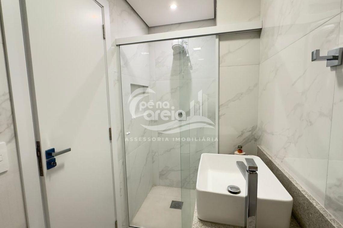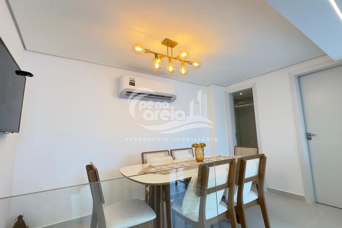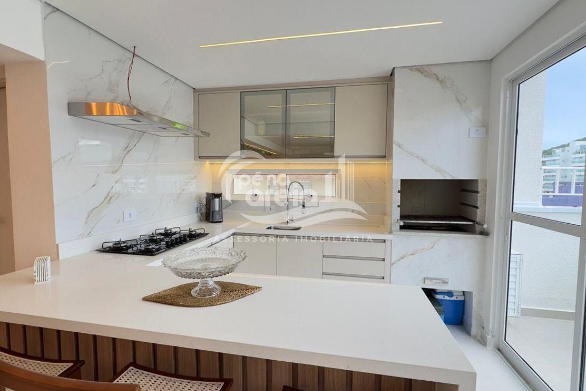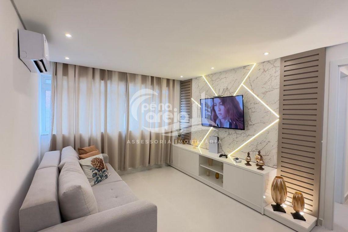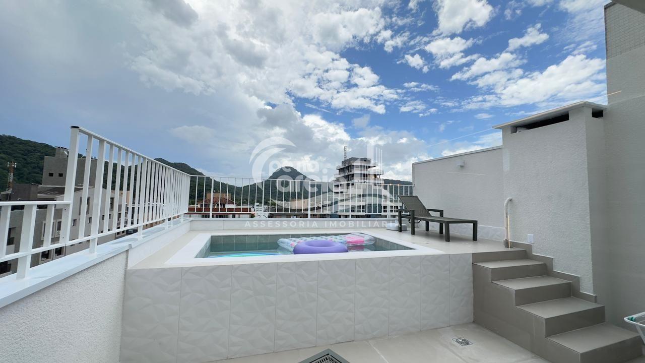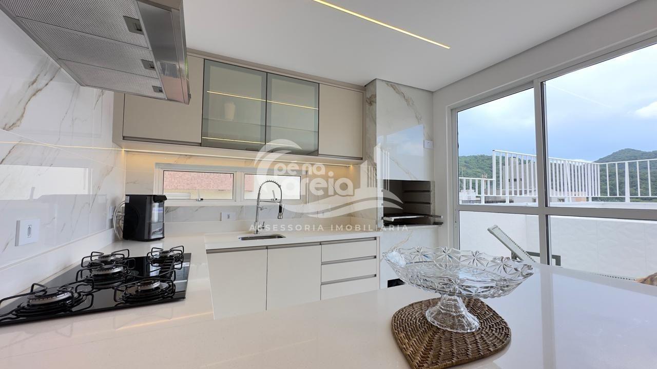 São 135 m² privativos, totalmente climatizada, finamente reformada e decorada. Possui ampla sala de estar com rebaixamento em gesso, 3 dormitórios (1 suíte) e banheiro social. No pavimento superior, sala de jantar integrada à cozinha sob medida, churrasqueira a carvão, lavabo e um incrível terraço com piscina exclusiva, ducha e vista para o mar e para a serra.